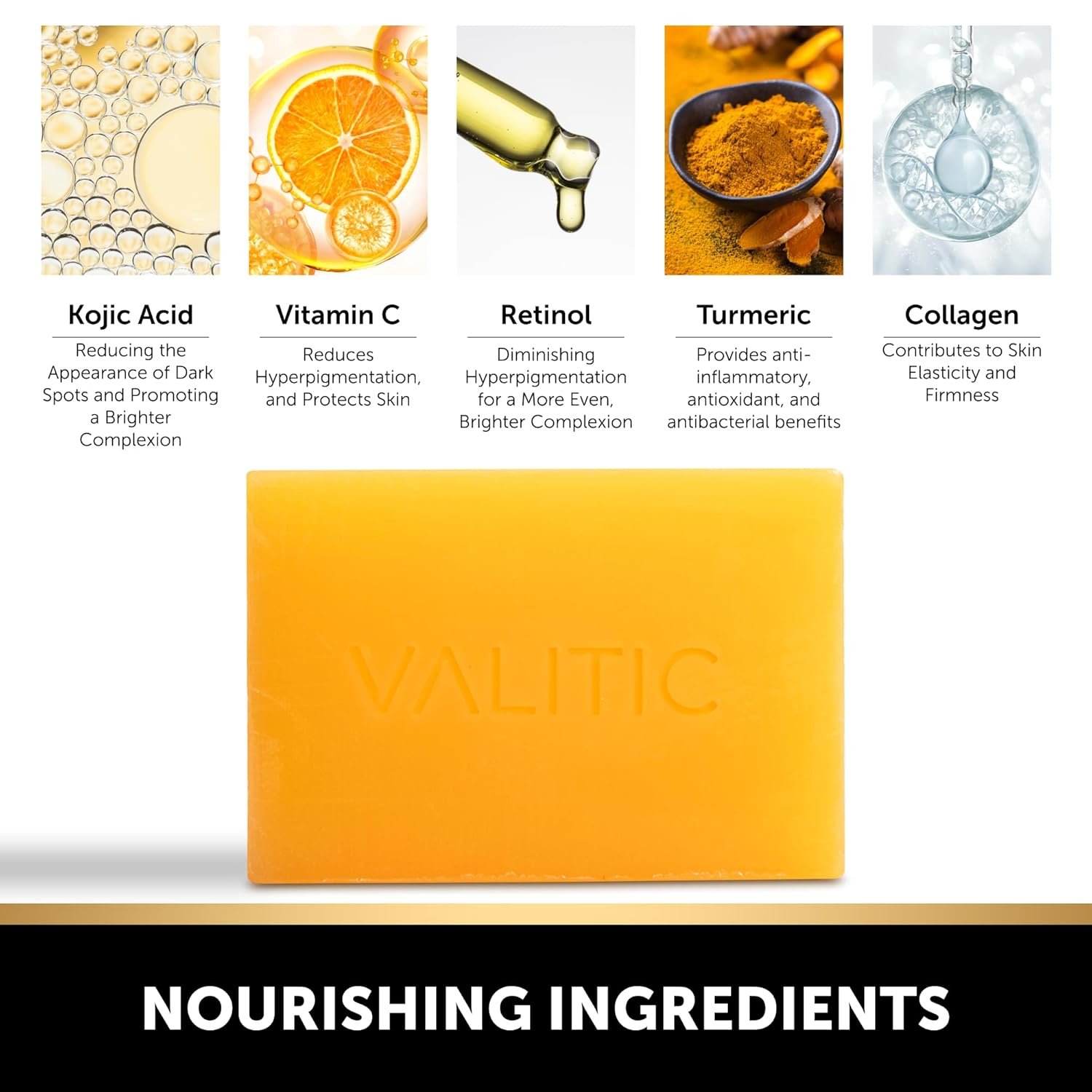 VALITIC Kojic Acid Dark Spot Remover Soap with Turmeric, Vitamin C, Retinol – Original Japanese Complex -Hyaluronic Acid, Vitamin E, Shea Butter, Castile Olive Oil – 3 Pack Bundle with African Net
